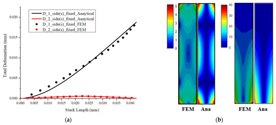 Generally, there is a strong agreement between the mathematical method and FEM results, as depicted in Figure 10, which presents deformation and stress profiles. In the case of two fixed ends (depicted in Figure 10b), although the stress distribution along the bar is not entirely consistent, the maximum stress at the four corners is accurately predicted. Notably, the scenario with two fixed ends exhibits greater stability in comparison to the case with only one fixed end. In the latter, the maximum deformation and stress are approximately 1/20 and 1/8 times larger, respectively.