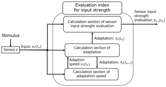 Figure 1 shows a flowchart depicting the calculation of the input strength using this method. First, the robot receives a stimulus from the environment at sensor . The output values of sensor are input to evaluate the strength, adaptation, and adaptation speed. Next, the adaptation speed is calculated using the input value of sensor . Subsequently, the value of adaptation is calculated using the input value of sensor and the adaptation speed. Finally, the strength evaluation value of the sensor input is calculated using the input value of sensor and the adaptation value. This process is performed each time an input is received.
