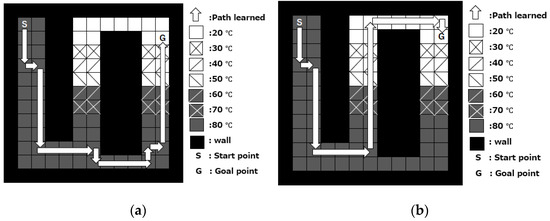 We determined the mean values and standard errors of the evaluation index for the strength of the sensor input in the experiment. The results of the previous and proposed methods for the 1000th trial of the experiment are shown in Figure 3. The learning paths of the agents obtained using the previous and proposed methods are shown in Figure 4 and Figure 5, respectively. The paths shown are learning paths for which the greedy algorithm is run after completing all the trials and are representative of the learning paths for each method. In the case of the previous method, the agent learned the path through the high-temperature area (Figure 4a) eight out of ten times and through the area of normal-temperature (Figure 4b) two out of ten times. In the case of the proposed method, the agent learned the path through the normal temperature area (Figure 5) ten out of ten times.