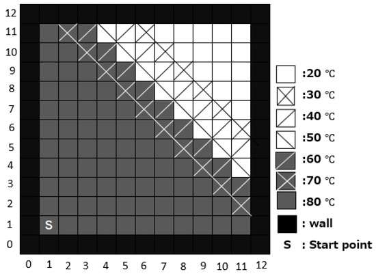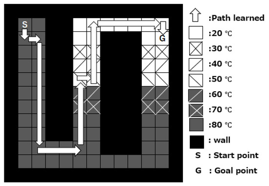 In this experiment, we performed a simulation to learn a path on a grid map, as shown in Figure 2. The robot was asked to learn a path from the starting point to the goal point. The robot can move one square per action and perform four types of actions: up, down, left, and right motions. The time and energy required for all actions performed by the robot were the same. The robot was equipped with a temperature sensor to detect the temperature, a collision sensor to identify wall collisions, and a position sensor to identify its position. If a robot performs an action that causes a wall collision, it returns to its original square. A high-temperature area is harmful because it increases the internal temperature of the robot, causing an internal breakdown. In this experiment, we set the temperature above 70 °C as dangerous. Therefore, the robot must learn paths to avoid hazardous/hot areas. The experiment was conducted ten times in the same setting for each of the previous and proposed methods.