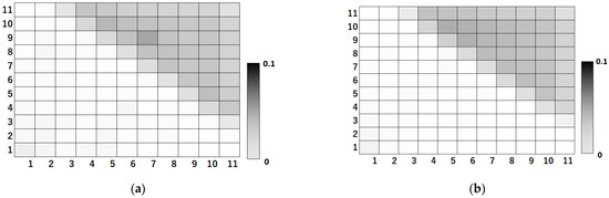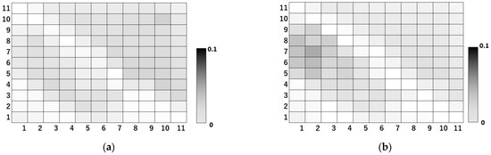 We compared the extent to which learning from the previous and proposed methods changed the percentage of robot visits to the environment. Figure 7 shows the percentage of robots visits to the environment from the first trial to the 500th trial (with insufficient learning) and the percentage of robots visits to the environment from the 1501st trial to the 2000th trial (with sufficient learning). The results of the previous method are shown in Figure 7. Figure 7a shows the percentage of visits made using the previous method by the robot with insufficient learning, and Figure 7b shows the percentage of visits made using the previous method by the robot with sufficient learning. The results corresponding to the proposed method are shown in Figure 8. Figure 8a,b show the percentage of visits by the robot with insufficient and sufficient learning, respectively.