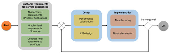 There is an opportunity to create new educational tools aligned with an educational methodology from its conception. Figure 1 depicts the extended educational mechatronics conceptual framework (EEMCF) that enables the student to understand abstract concepts from which mechatronics engineering tools are built via four reference perspectives; process, application, scenario, and artifact [22]. Based on this EEMCF, an educational tool design methodology is proposed as an iterative process that starts with the functional requirements for the learning experiences as input specifications. Later, for the educational tool design, performance calculations are performed based on the given requirements, and a computer-aided design (CAD) is developed. Then, for the implementation, a manufacturing process is chosen, and a physical evaluation of the educational tool is carried out. This process is performed iteratively until the requirements are met (see Figure 2). Once the educational tool is successfully created, it is ready to continue generating different instructional designs depending on the decision as to which mechatronics core concept to build.