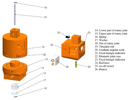 After the design phase of all the pieces, the 3D printing process can start for most of the components of the robot manipulator. Specifically, components 1, 3, 4, 5, 6, 8, 12, 13, 14, 15, and 23 are entirely made from PLA plastic using a standard 3D printing process. In addition, aluminum is used in the base and graduate links particularly to manage the weight and stress that the complete model could generate during its normal functioning. According to Figure 3, component 2 (base link) is a 2” aluminum square tube with two drilled 7/16” holes on each side. These holes are made to fix the base and the union point. Component 10 (graduate link) is a 1 ¼” aluminum square tube with two drilled 7/16” holes on each side of the tube; these holes are made so the rotary joint can be fixed with any joint of the manipulator robot. The joint arm also includes a graduate scale on each of the four sides that shows the displacement by 1 cm at each mark. The rotary joint has a rotational system that includes 36 positions to define a resolution of 10° and has a 1/8” × 3 ½” screw fully threaded, two pieces of a 1/8” nut, a 1/8” × 1 3/16” washer, and a 1 ½” long spring.