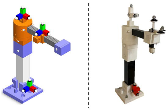 The chosen artifact or mechatronic prototype to be developed in this work is a serial robot manipulator. It has to include the necessary robot components (rotational joint, prismatic joint, links, base, and an end-effector) to illustrate a specific set of mechatronics core concepts such as translation, rotation, homogeneous transformation, and forward and inverse kinematics, among others. The aforementioned is part of the requirements of the abstract level. Moreover, the graphic level encompasses the use of the MoCap laboratory; therefore, the artifact has to consider the use of the MoCap markers and a system based on Simulink to obtain the linear and angular position of objects on the robotic arm. For the concrete level, the artifact has to be designed from a modular perspective. It has to be reconfigurable and ergonomic since it will be manipulated through hands-on activities (see Figure 3).
