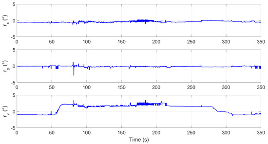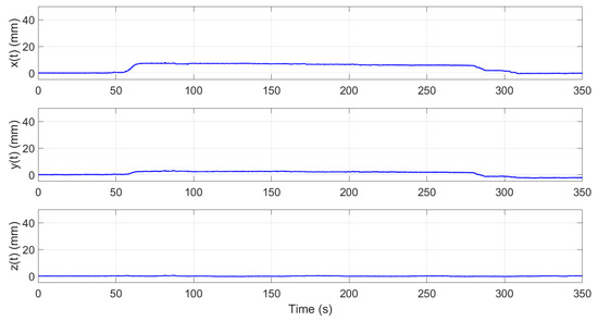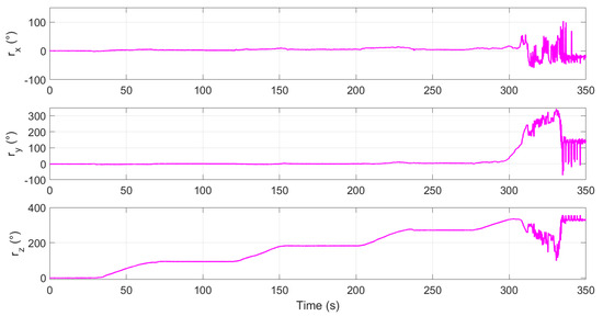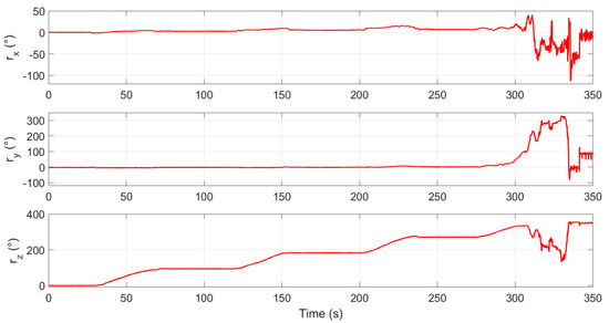 It is worth noting that from approximately t = 310 s in Figure 15 and Figure 17, considerable uncertainty in the inertial orientation of the revolute joint frame and the end-effector frame, respectively, are depicted. These orientations, defined by the composition of three basic rotations in 3D, are computed by the API of the MoCap system utilized for the experiments [26]. The algorithm used to calculate these angles requires knowing the position of at least four markers that define a frame and are detected by the MoCap system, as shown in Figure 24.