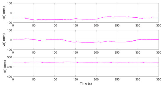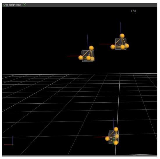 Therefore, if a marker becomes occluded during an experiment, the algorithm cannot retrieve the angles that define the orientation of that specific frame, resulting in the phenomena indicated in Figure 15 and Figure 17. On the other hand, as the position of the origin of a frame can be retrieved using only three markers, the occlusion of one marker does not affect its computation, as shown in Figure 14 and Figure 16. Even though this is an undesirable consequence of the occlusion of markers during an experiment, it can be used to illustrate the geometric relationship between consecutive frames and the nature of the algorithms in the API of the MoCap system.