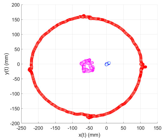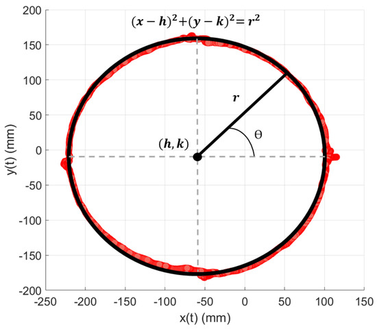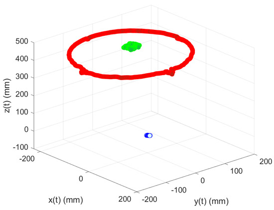 - The end-effector frame includes the set of points reachable by the robotic arm, also called the workspace. It can be noted that the point cloud defines a circumference that is also the distance around the widest part of a round object or a line enclosing a circular space. Then, the equations describing the parametric form of a circle (connected line of points from Section 4.2) are:wherewith being the angle of rotation , r is the radius of the link of the robot that connects the revolute joint and the end-effector, and is the center of the circle (real base of the robot, which is not the same as the robot base frame). Figure 21 depicts the overlapping circle equation with the end-effector frame point cloud. Therefore, the participant can link the robot workspace with an equation of a circle centered in . Moreover, the workspace is the total volume swept out by the end-effector as the manipulator executes all possible motions. It only includes the points in the circumference of the circle.