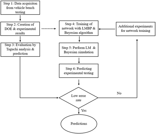 The proposed approach consists of three stages. In the first stage, external loading values are collected from bench testing acting on the joints. It is a specific test only for engine suspension joints. In the second stage, TM experiments with actual joint conditions are performed to obtain training and test data for the NN. Seven controlled factors influencing the torque–clamping loading relationship and bolt loosening rate are divided into two levels, and 16 Taguchi tests are conducted. In the third stage, NN is performed with the Levenberg–Marquardt and Bayesian regularization algorithms to create the relationship between the controlled factors and the loosening rate. The MSE (mean squared error) values are calculated to evaluate the prediction errors of NN. By evaluating all the factors that may influence the loosening of the bolted joint, an experimental set is created using the Taguchi method, and physical transverse vibration tests are carried out for the same connection structure with the vehicle. In the experimental design, horizontal vibration displacements are determined by evaluating the vehicle bench test data. In this way, the vibration tests in the experimental design are performed on the basis of the vibration data of the real connections. The outputs after the physical experiments are evaluated to determine the signal-to-noise ratios and the rank of the most influential parameters.