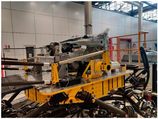 A multiaxial simulation table (MAST), which is shown in Figure 3, was used for the data acquisition and measurements for the aluminum casting engine mount component. The vehicle front end was mounted to the test bench plate, and half shafts were mounted to the torque input fixture to apply the real change gear moments. The road load data accelerations from the table were applied to the vehicle front end. Then, during these movements, responses were acquired and analyzed. In addition, using the MAST test bench seat with dashboard structural durability, NVH tests could be performed up to 150 Hz input level. The model of the table was an MTS Model 353.20 Square Hexapod Multiaxial Simulation Table (MAST™) with two torque input fixtures (TIFs). Analog signals were collected from the system for the hydraulic system, and displacement control was implemented by checking the analog input feedbacks. The MAST test bench used six different servo-hydraulic actuators to give the road input, which was collected from the proving ground. In addition, two individual servo-hydraulic actuators were used for the torque inputs to the half shaft. The system enabled performing engine mount durability tests by applying the operational loading configuration while controlling different outputs. The system was used as the input to control itself via acceleration. To check the convergence between the road and bench responses, main outputs were the engine mount body side, engine mount engine side, and front body rail accelerations, as well as the torque strut load and half shaft torque. In addition, to follow the fastener deformation level, the component response was collected by means of strain gauges. In the end, the system allowed the movement of test specimens in six degrees of freedom: X, Y, and Z relative movements and roll, pitch, and yaw angular movements. The vehicle front end and vehicle engine were located on the test bench. Four different road profiles were applied to the test bench, and the deformation levels were acquired.