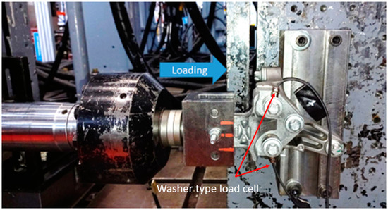 The monoaxial test was set up according to the channel R4_ 0_Deg, whereby the Y-axis of the movement and strain results were the most severe. The highest radial deformation acting on the connection under bench conditions was 150 µε. The minimum radial displacement value of 0.15 mm was set in the monoaxial servo-actuator, which obtained similar deformations for R3_0_Deg and F4_0_Deg channels with respect to MAST. The maximum level was determined as 1 mm to accelerate the loosening rates and to prevent the parts from being subjected to fatigued fracture before loosening. Above 1 mm level of displacement from actuator, we tried some tests, and some cracks were observed on the parts. The aim was to see the loosening performance of the bolted joints between 0.15 mm and 1 mm radial displacement. The monoaxial test was set as the Y-axis, as shown in Figure 6. All fasteners were tightened directly to the 30,000 and 45,000 N target clamping loads with a torque wrench, which are given in Table 3 by checking the load value of the washer type loadcell, as shown in Figure 6. Displacements were applied by the MTS hydraulic actuator to the specimen, and an HBM MGC-Plus data acquisition system was used for data acquisition; analysis of the data was completed using the Catman HBM data acquisition software (catmanAP 5.4.2.11 version).