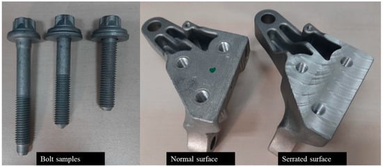 Metal and aluminum washers, serrated lower female thread parts, and connecting parts with the hole diameter and thickness adjusted were produced to provide the Taguchi levels determined such as clamping length, bearing area, joint rigidity, and surface conditions between parts. The serrated surface of the lower female thread part was processed to increase the friction coefficient of the surface. All materials were renewed after each test. Test specimens are given in Figure 7 and Figure 8.