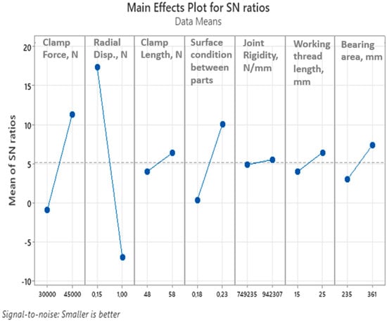Table 4 and Table 5 express that the degree of effect of the selected parameters such as radial displacement, clamp force, and surface condition was high. A small modification in these parameters would cause a significant change in loosening rates. An experiment using Level 1 radial displacement, Level 2 clamp force, and Level 2 surface condition would work best to minimize the loosening rates. Figure 9 and Figure 10 expressed the main effects of signal-to-noise ratios and means.