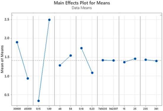 A Taguchi L16 (2)7 orthogonal experimental design matrix was established in the experimental test, and the signal/noise ratios (S/N), mean values, and effect rank were shared for each input parameter, as given in Table 4 and Table 5. The signal-to-noise ratio is a measure of robustness, which can be used to determine the input factor that minimizes the effect of noise on the response. The S/N ratio is an output that compounds the mean and variance. The aim in robust design is to diminish the sensitivity of a control characteristic to noise factors. Minitab 18 software was used to perform the Taguchi analysis.
