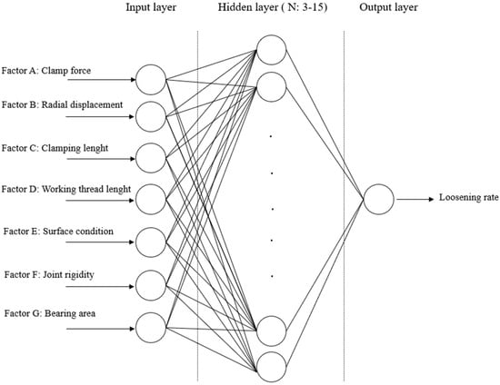 MATLAB R2020a was used to develop the ANN model, which is composed of three layers as given in Figure 11. The neural network model had seven input neurons, 3–15 neurons in the hidden layer, and one output neuron. Figure 11 presents the topology of the 7–3:15–1 network. Factors A to G were as follows: clamp force, radial displacement, clamping length, surface condition between parts, joint rigidity, working thread length, and bearing area, respectively.