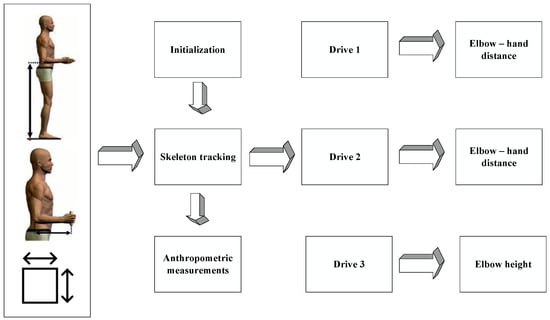The acquisition of the anthropometric measurements consists of detecting the body dimensions of the operator in front of the assembly workstation. After a short initial setup for the necessary input configurations, the skeleton tracking function is launched. Specifically, the skeleton is a set of points (joints) positioned in relevant areas of the body. The relative distances between the points of the skeleton are calculated, and the anthropometric measurements of interest are extracted. The detected anthropometric measurements are transmitted to the anthropometric module of the A3S logic control, which proposes the positions that the workstation has to assume to the actuators. The outputs of the anthropometric module are the inputs for the self-adaption of the A3S (Figure 3).