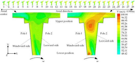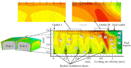 - In the space between two adjacent rotor poles, the cooling air velocity gradually decreases along the axial direction from the end region to the rotor center. Simultaneously, the cooling air velocity gradually increases along the radial direction from the rotor shaft to the rotor pole surface, and the maximum cooling air velocity is 99.35 m/s. The cooling air velocity distribution of five ventilation ducts of the rotor is uniform, and the air speeds difference of the average and maximum are 1.2 m/s and 3.3 m/s, respectively.