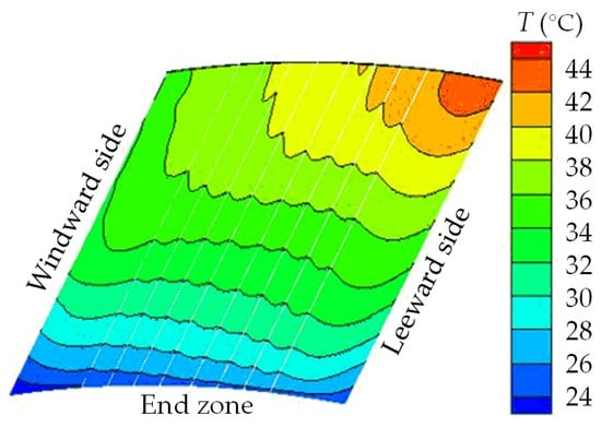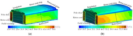 - The temperature distribution law of various rotor components of the pumped storage generator motor is as follows: the temperature of the rotor area gradually decreases from the axial center to the end region along the axial direction; the temperature gradually decreases from the leeward side to the windward side along the circumferential direction; and the temperature gradually decreases along the radial direction from the rotor shaft to the rotor pole surface. The highest temperature of the rotor appears in the field winding zone. Specifically, in rated generating operation and rated pumping operation, the highest temperatures are 75.6 °C and 78.3 °C, respectively. Uniform cooling air distribution can effectively improve the heat dissipation performance of the rotor area.
