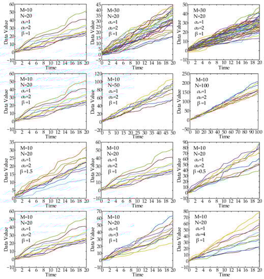 These twelve sets of data sets have different model parameters, so as to compare the applicability of the method to different forms of data. In these twelve groups of data, 1 time unit is taken as a sample point, each data set contains degradation paths, and each degradation path contains data points. Data sets 1~3 have the same degenerate model parameters and the number of data points, but they contain different paths . Data sets 4~6 have the same degenerate model parameters and the number of paths, but they contain different data points . Data sets 7~9 have the same number of data points and paths, but their model parameters are different. Data sets 10 to 12 have the same number of data points and paths, but their model parameters are different.