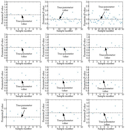 As shown in Table 1, when prior distribution 1 is adopted for unknown parameters, the estimated values have better estimated accuracy. It indicates that the gamma distribution can be used as prior distribution of unknown parameters and can obtain better estimated accuracy. When prior distribution 2 is adopted for the unknown parameters, the estimated accuracy of the parameters and is poor. Combined with Figure 3, when the moment method is used to estimate the hyperparameters, the randomness of the samples will cause some sample points to deviate from the boundary of the true interval, and the prior distribution of the parameters and is greatly affected by the boundary value of the hyperparameters estimated value. Combined with Figure 4, when the moment method is used to estimate the hyperparameter , the parameter estimated values of all samples are evenly distributed on both sides of the real value. When the uniform distribution is used as the prior distribution of the parameter , the accurate value of the prior distribution will lead to a more accurate posterior distribution after the likelihood function modification. On the whole, when prior distribution 3 is adopted for unknown parameters, it has good estimation accuracy for the unknown parameters. This is because prior distribution 3 combines the advantages of the above two prior distributions to achieve good estimation results for parameter , and .