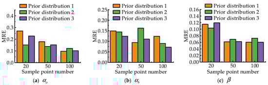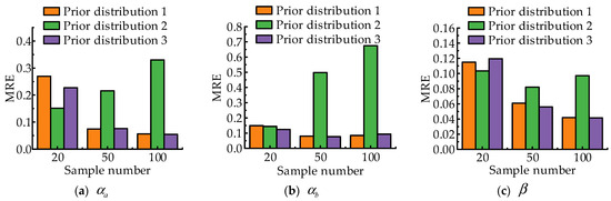 The robustness of different prior distributions for degradation processes with different parameters was discussed in this part. Each degradation process in Figure 2 was simulated for 10 times, respectively, and the mean relative error (MRE) was used to calculate the statistical characteristics of parameter evaluation results under different prior distributions. The mean relative error of parameter estimation under different sample numbers is shown in Figure 5. It can be seen from Figure 5, with the increase in the sample number, the estimation errors of the prior distribution 1 and prior distribution 3 for the parameter and gradually decrease. This shows that the prior distribution without information can increase the accuracy of parameter estimation when the sample number is large. The estimation error of the prior distribution 2 for the parameter and increases with the increase in the sample number. The reason for this phenomenon is that extreme parameter estimation values is easy to produce by using the moment estimation method when the sample number is large. The uniform prior distribution constructed on this basis has a large error. With the increase in the sample number, the estimation accuracy of parameter with different prior distributions is improved.