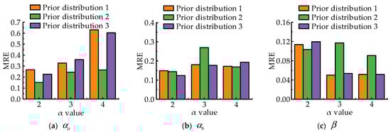 The mean relative error of parameter estimation under different value is shown in Figure 7. The estimation error for using the prior distribution 2 is minimal, but the prior distribution 2 is unstable for the estimation of . On the whole, the prior distribution 3 has good stability for estimation of different parameters.