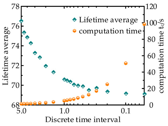 According to the characteristic of the stochastic process, the discrete time interval does not affect the value of lifetime distribution. However, when the time interval is too large, it will cause a certain error in the result. At the same time, the amount of computation will rapidly increase with small time interval. The changes of lifetime average and calculation time with discrete time are shown in Figure 9. It can be seen from the Figure 9, with the decrease in discrete time interval, the average life gradually converges to a certain value. However, the computation time increases rapidly with the decrease in discrete time interval. Therefore, when using the method in Section 3.3 to calculate the lifetime distribution, appropriate discrete time intervals should be selected to obtain more accurate calculation results with less calculation time.