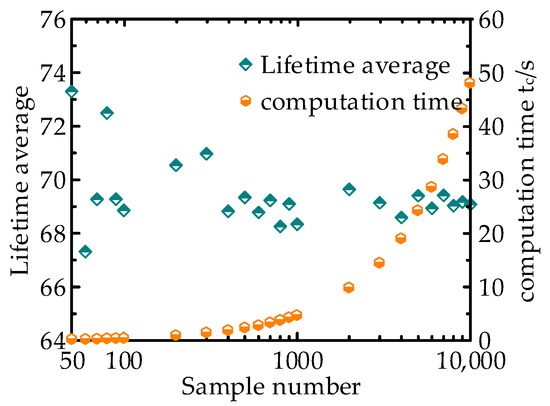The changes in average lifetime and calculation time with the number of samples are shown in Figure 10. It can be seen from the Figure 10, when the number of samples is small, the average life has a large volatility. When the number of samples is greater than 1000, the volatility of the average life gradually decreases and gradually converges to a certain value. The calculation time will increase with the increase in the number of samples. Since the horizontal coordinate in the figure is a logarithmic coordinate system, the calculation time and the number of samples show an exponential change relationship. In fact, under the linear coordinate system, the calculation time will show a trend of linear increase with the increase in the number of samples.