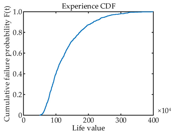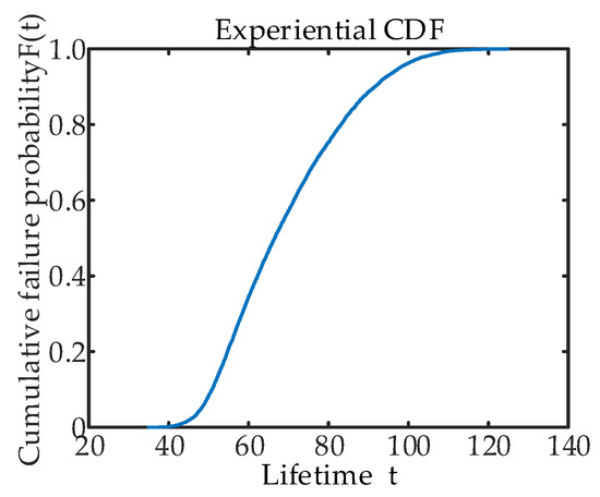 The frequency histogram of lifetime values is shown in Figure 11. It can be seen from Figure 11, the lifetime value presents a positive skew distribution, that is, the curve is shorter on the left side and longer on the right side at the highest point. The statistical characteristics of the lifetime value are shown in Table 2. It can be seen from the Table 2 that the average value of the sample lifetime is greater than the median value, and the skewness of the sample lifetime is greater than 0, indicating a positive skewness distribution. The experience cumulative failure distribution obtained from the lifetime value of each sample is shown in Figure 12. According to the cumulative failure distribution, the lifetime value under any reliability can be obtained.