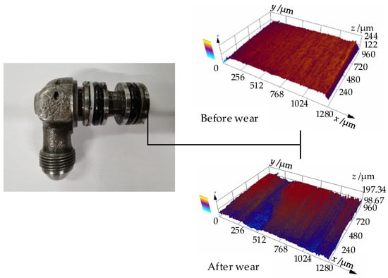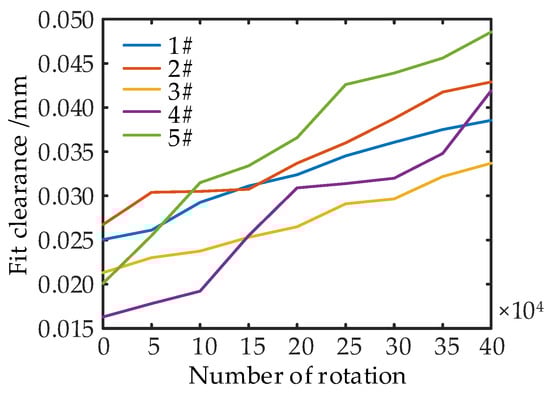 The wear degradation process of the aviation hydraulic rotary joint was analyzed in this Section. The fit clearance between the elbow joint and the nozzle sleeve is one of the main reasons that lead to the reliability reduction in the hydraulic rotary joint. When the fit clearance of the rotary joint increases to the specified failure threshold, the rotary joint is considered to have failed. The wear of the rotary joint is shown in Figure 13.