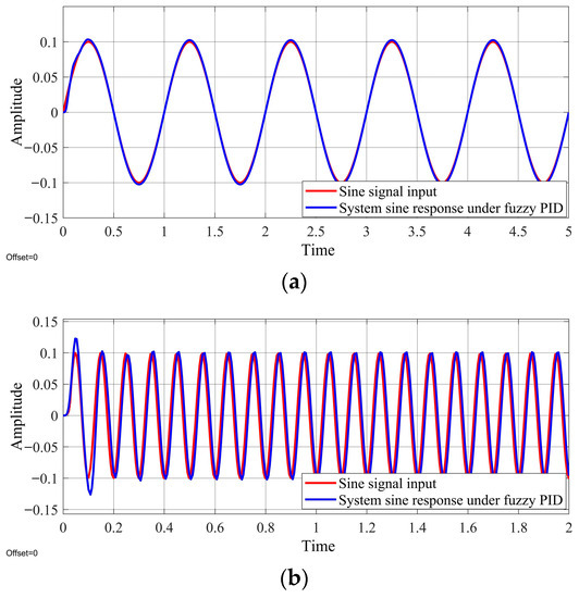 A simulation model was established in the Simulink environment. Figure 9 and Figure 10 show the responses of the system to step and sine signals, respectively. With the addition of the adaptive fuzzy PID control algorithm, the response curve of the hydraulic loading system with electro-hydraulic proportional control to a step signal reached and stabilized at the preset value within 0.3 s and had no oscillation or overshoot. The optimized system also performed well in replicating sine signals of different frequencies.