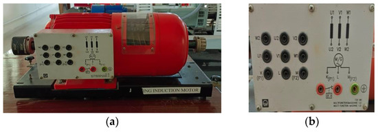 The chosen WRIM is a versatile three-phase multi-functional machine equipped with a slip-ring rotor. This inherent flexibility enables the machine to serve as either an asynchronous or synchronous motor or generator, as shown in Figure 1. The distinct terminals of the rotor designated as K, L, and M are clearly identified in Figure 1b. These terminals possess unique attributes due to the varying winding configurations associated with each. This adaptability enables the WRIM to operate effectively in synchronous or asynchronous modes. The experimental investigations described in the study are conducted while the machine operates in its asynchronous motor mode. This operational mode denotes the machine performing as an asynchronous motor during the experiments. To replicate a state of a healthy rotor, the K-L-M terminals are shorted. This action likely symbolizes a balanced rotor condition where all three terminals are electrically linked, representing a symmetric setup. Conversely, to imitate an asymmetrical condition, the K-M terminals are shorted. This configuration implies that the K and M terminals are electrically connected. This arrangement serves to mimic a situation where rotor asymmetry is introduced. Table 1 presents specifications for the WRIM operating in an asynchronous motor mode, outlining the motor’s nameplate information for this particular mode.