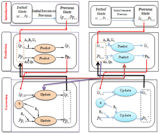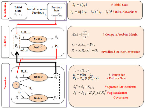 Dual nonlinear Kalman filters involve the simultaneous operation of two filters, wherein one is dedicated to estimating the state, and the other focuses on estimating parameters as shown in Figure 5. These filters operate concurrently to estimate both states and parameters from observational data. While the state filter treats parameters as constants, the parallel parameter filter considers states as known entities. The equations involved in Dual Extended Kalman Filter is as follows:
