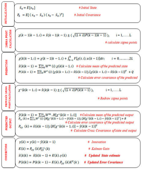 The unscented Kalman filter is an alternative to the extended Kalman filter (EKF) for handling non-linear systems. The UKF avoids the linearization step employed in the EKF, which can lead to inaccuracies in non-linear systems. Instead of linearizing the system dynamics and measurement functions, the UKF employs a deterministic sampling technique known as the “unscented transformation”. This technique effectively captures the mean and covariance of a set of carefully selected sigma points through non-linear transformations. These sigma points capture the distribution of the state space more accurately than linearized points used in the EKF. The equations involved in Unscented Kalman Filter is shown in Figure 3.