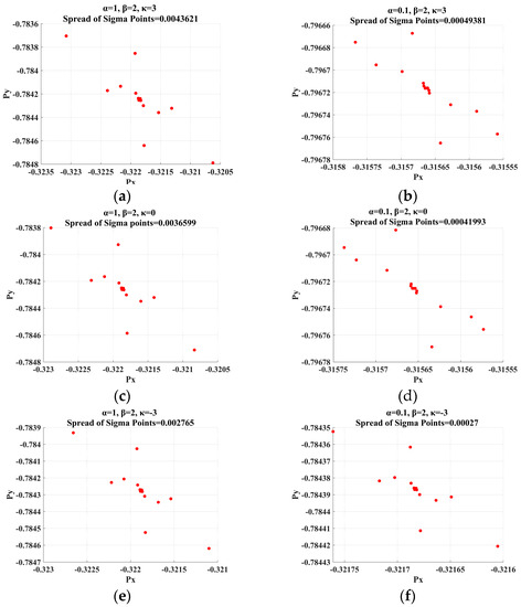 In the UKF, the filter’s performance was enhanced through the appropriate selection of scaling parameters α (alpha), β (beta), and κ (kappa) [21]. The spread of sigma points is illustrated in Figure 4. By calculating the square root of the sigma points’ covariance, we obtain the spread value. By adjusting the values of the scaling parameters, the distribution of sigma points varies, and its corresponding value is also determined. The scaling factors associated with the smallest obtained value are adopted for the UKF and DUKF algorithms. A subset of the scaling factors is presented in Figure 4. It can be inferred from Figure 4f that α = 0.1, β = 2, and κ = −3 yield the smallest value of 0.00027. Throughout this work, we utilized the values α = 0.1, β = 2, and κ = −3.