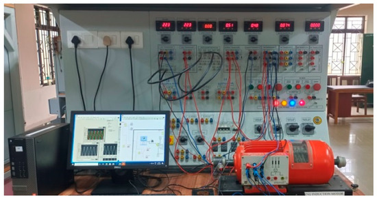 The real-time experimental setup consists of a 1.0 kW WRIM connected to the DAQ USB-6351 for data acquisition, as illustrated in Figure 6. Approximately 5000 sampling instances of stator current and voltage data were collected from the WRIM under no-load conditions at a sampling rate of 1 ms using the NI USB-6351DAQ and LabVIEW 2018 software. The acquired voltage data are used as input for the extended Kalman filter, unscented Kalman filter, and their respective extensions for state estimation, while the acquired current data serve as measured values used for residuals. The four Kalman filters are estimated offline with the assistance of MATLAB R2021a software. The assumptions made throughout the analysis are presented in Table 3.