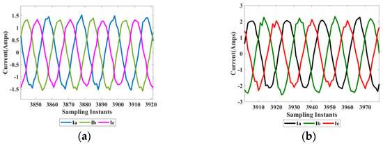 Enlarged view of real-time acquired current data. (a) Healthy rotor,(b) Asymmetry rotor.