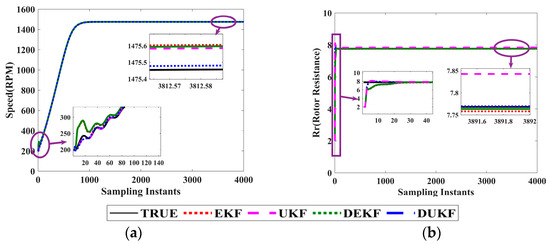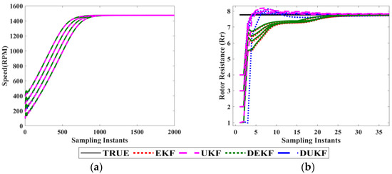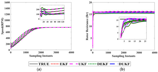 From Figure 16a, speed estimation in the healthy condition, EKF provided a −115.12% bias, UKF provided a −105.12% bias, DEKF provided a +0.06% bias, and DUKF provided a +0.07% biased estimate. The range of variation is 115.27. From Figure 16b, regarding rotor resistance estimation in the healthy condition, EKF provided a +50.232% bias, UKF provided a +46.232% bias, DEKF provided a −0.005% bias, and DUKF provided a +0.072% biased estimate. The range of variation is 50.237.