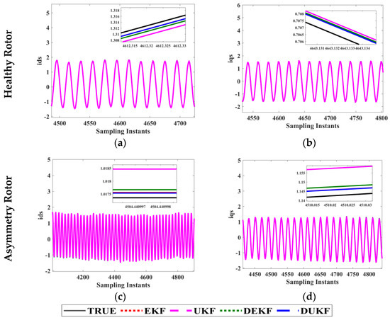 Figure 13a,b show the output ids and iqs for the healthy rotor, displaying both measured and estimated currents.