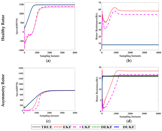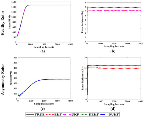 In Figure 15c, for speed estimation in the asymmetry condition, EKF failed to estimate, UKF provided a −45% bias, DEKF provided a −0.5% bias, and DUKF provided a −1.5% biased estimate. The range of variation is 44.5. Finally, in Figure 15d, for rotor resistance estimation in the asymmetry condition, EKF failed to estimate, UKF provided a +40.85% bias, DEKF provided a +0.25% bias, and DUKF provided a +0.45% biased estimate. The range of variation is 40.6. However, in both conditions, dual filters proved to be robust and provided low biased estimates.