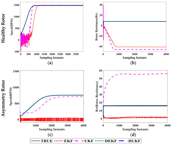 In Figure 16c, in the case of speed estimation under asymmetry conditions, EKF provided a −9.5% bias, UKF provided a −8.3% bias, DEKF provided a −0.95% bias, and DUKF provided a −2% biased estimate. The range of variation is 8.55. Finally, in Figure 16d, For the rotor resistance estimation in the asymmetry condition, EKF provided a +2.3% bias, UKF provided a +1.6% bias, DEKF provided a +0.25% bias, and DUKF provided a +0.45% biased estimate. The range of variation is 2.05. However, in both conditions, dual filters are robust and provide low biased estimates.