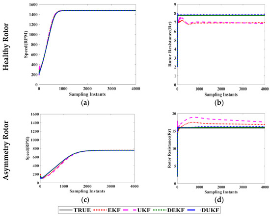 Motor speed and Rr are estimated by all four Kalman filters. To assess the effectiveness of these filters, various analyses are conducted on their estimates under different operating conditions, namely healthy and asymmetry cases.