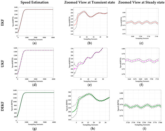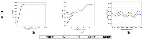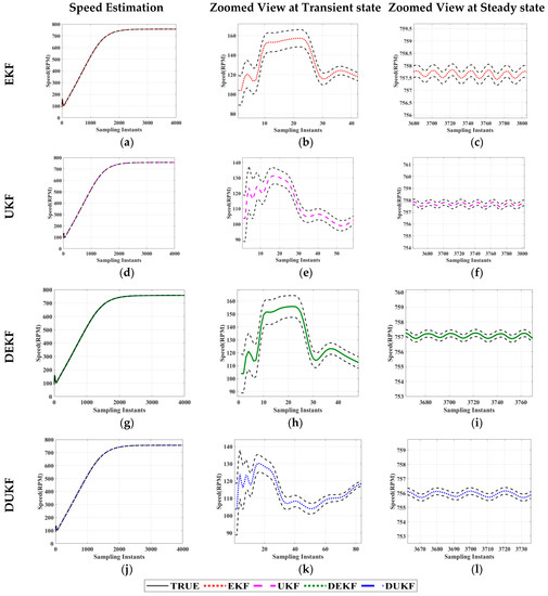 Evolution of speed estimation of (a–c) EKF, (d–f) UKF, (g–i) DEKF, (j–l) DUKF with filter convergence in healthy rotor.