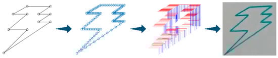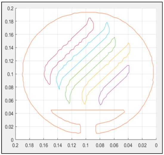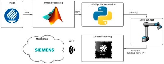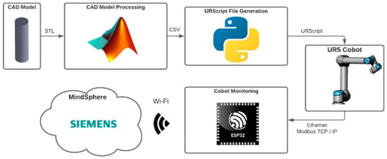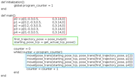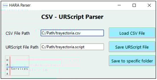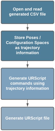 Additionally, contrary to the process shown in [,,], in which an operator loads the program to the robot based on the waypoint coordinates, the system described in this paper uses a parser that translates the selected coordinates into a file in the proprietary programming language URScript® [] to automate the process. This feature proves invaluable when more intricate trajectories require a large number of points to perform a certain task.