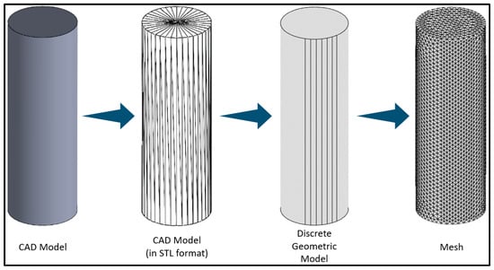 Figure 4 provides a visual representation of the transformation from CAD model to mesh. From left to right, the original CAD Model, the STL format CAD Model, the DGM, and the mesh. The original piece for this CAD model was a regular cylinder.