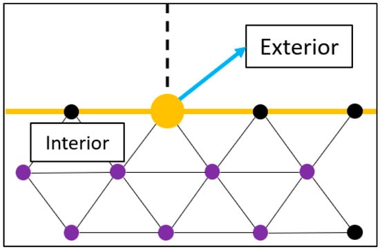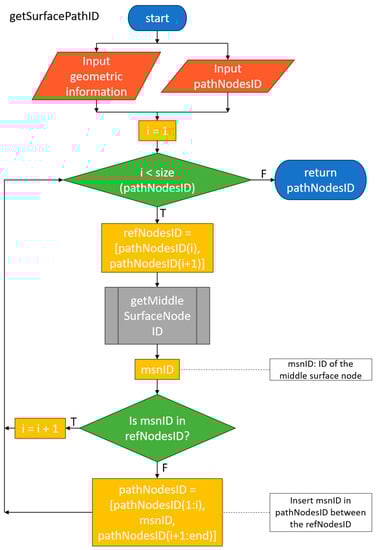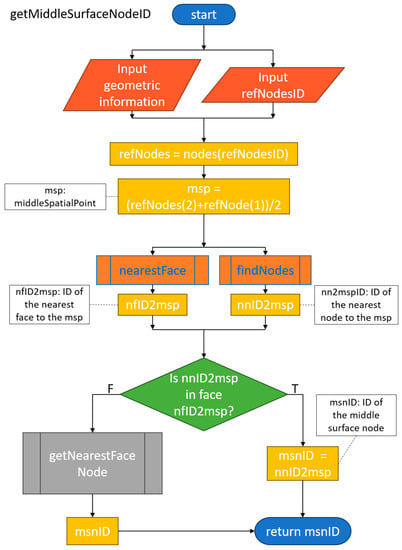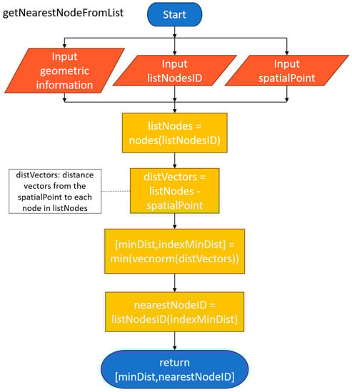 Before the explanation of the algorithms, it must be clarified that the classes DGM and mesh and their respective attributes and methods are used in this section. For further information, it is recommended to read the documentation of the PDE Toolbox []. There are attributes and methods of the classes of the PDE Toolbox [] that are referenced in the figures of the following subsections. The attributes are placed inside a red regular rhomboid and are denominated as “geometric information”. The methods “findNodes” and “nearestFace” are depicted as predefined processes in the flowcharts inside orange rectangles with vertical parallel lines.