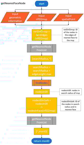 The second algorithm, the “Nearest Node from Face”, is illustrated in Figure 8. The inputs of the algorithm are the coordinates of the spatial point and the ID of the nearest face to the spatial point. Using the ID of the nearest face and the attributes of the DGM, the nodes on the edges of the nearest face to the spatial point are extracted. The nearest face ID and the spatial point are input to the Nearest Node from List to achieve the shortest distance between the spatial point and the edges of the nearest face.