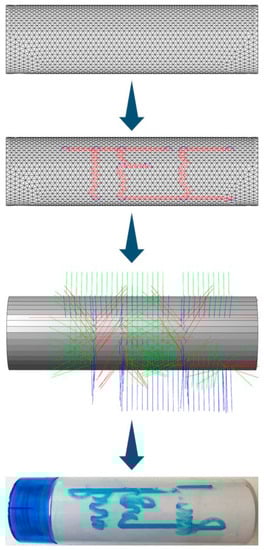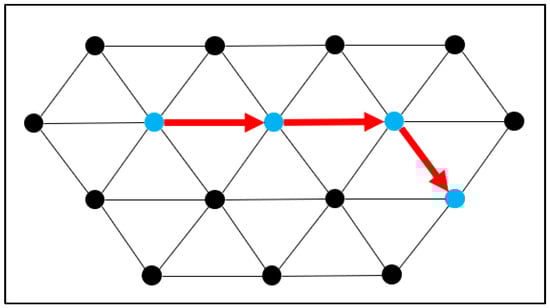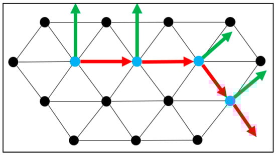 The array of the selected nodes and the mesh are used as inputs for an algorithm for path planning in the surfaces of a mesh, developed with the functions of the MATLAB PDE Toolbox []. Once the path over the surface of the mesh is traced, both the path and the mesh are used to calculate the pose of each waypoint of the trajectory. Both the path planning algorithm and the pose calculation will be explained in further detail in Section 2.4.1 and Section 2.4.2, respectively.