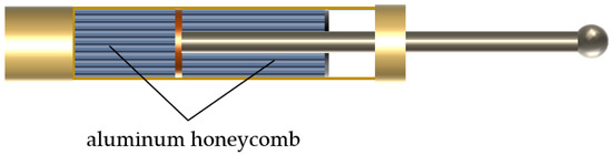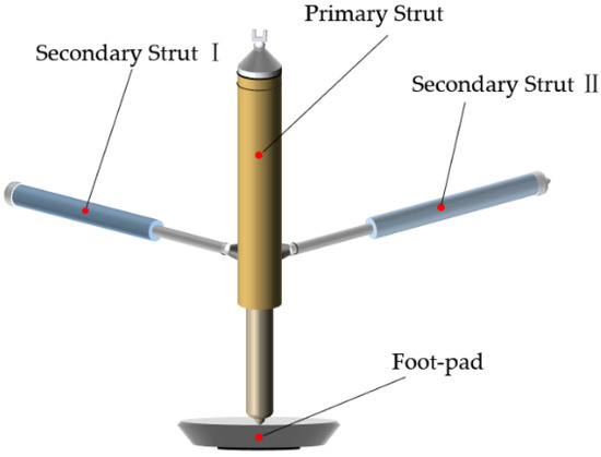 Figure 1 shows the typical design structure of the LBM from a Chinese lunar lander, which includes a primary strut, two secondary struts, and a foot-pad [30,31]. The primary strut cushions the longitudinal impact load, while two secondary struts cushion the transverse impact load. The foot-pad serves as the main support component [32]. The primary and secondary struts are filled with aluminum honeycomb material as buffer elements [33,34], as shown in Figure 2.