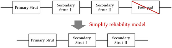 The composition and operation of the LBM reveal that its performance is determined by the primary strut, two secondary struts, and foot-pad. The foot-pad’s primary challenge is its strength, which can be ensured by increasing its strength margin, rendering its reliability as 1. In other words, the foot-pad does not influence the system state (success or failure) and is not included in the LBM’s reliability model. In addition, the inability of any one strut will lead to the failure of the LBM. Thus, the LBM can be regarded as a series system consisting of the primary strut, secondary strut I, and secondary strut II. Figure 3 provides the LBM’s reliability block diagram.