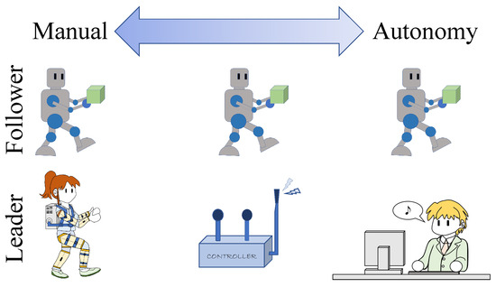 Giving partial autonomy to the follower robot or switching autonomous operation modes is an effective solution for reducing the burden on the operator. When considering the degree of autonomy as shown in Figure 1, the degree of autonomy gradually proceeds from left to right, where direct operation is on the left and pure autonomous operation is on the right.